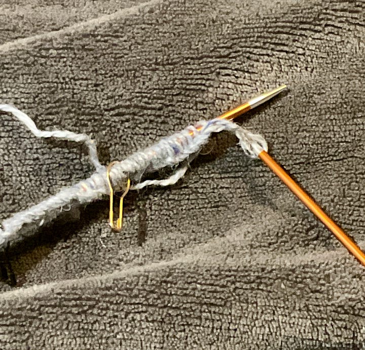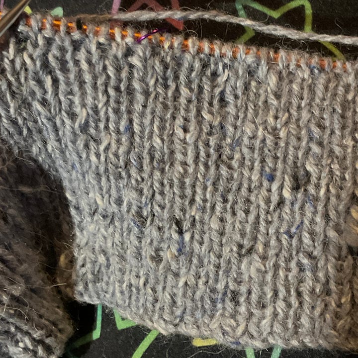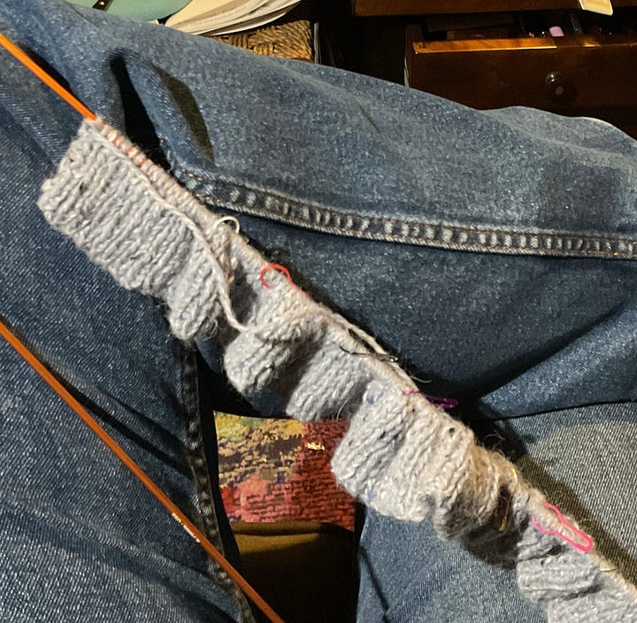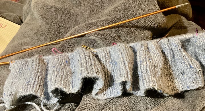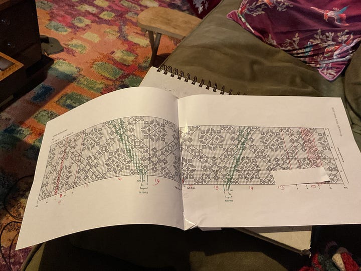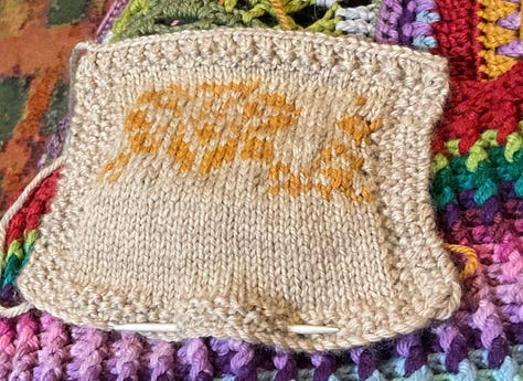 The first mistake was ordering the wrong colours. I was expecting light pink and dark red. Not what I ended up ordering. Blame too many tabs open at once to compare colours. I did make up a swatch this time, only the 2nd or third I’ve even done. So far I’ve read the pattern wrong for the starting stitches and had to redo the whole back waistband.