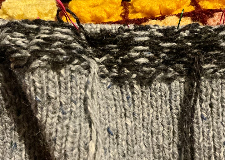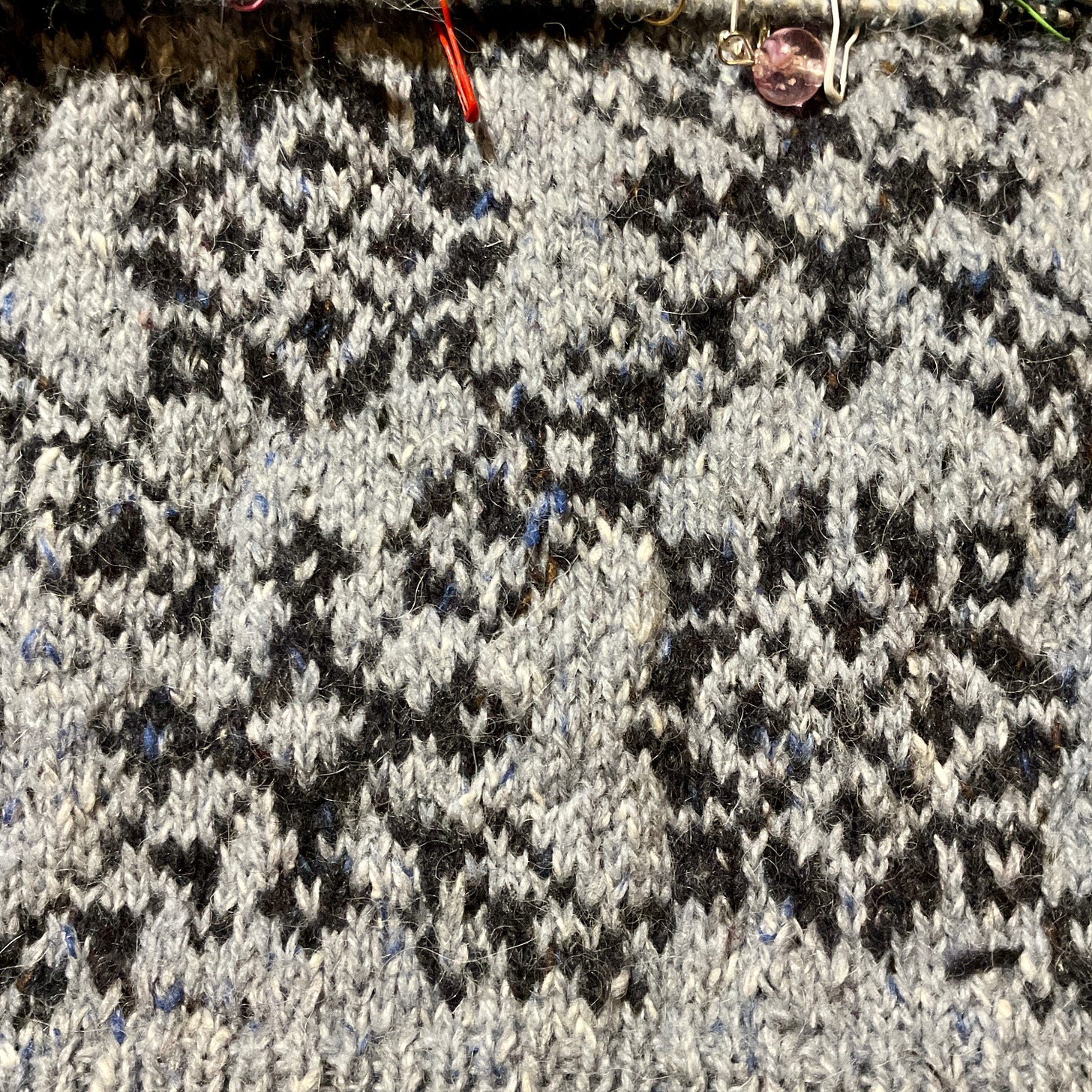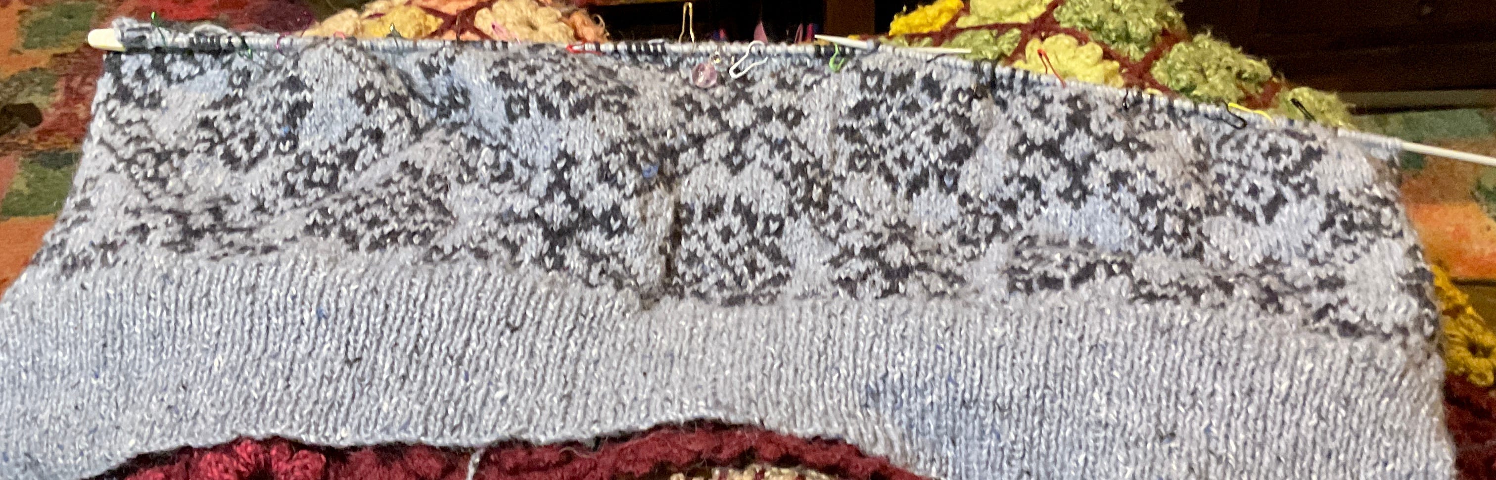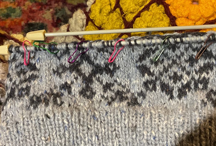 My saviour has been an app AND some very carefully placed stitch markers. For some reason I thought I was clever enough to not need them — I am not. So now I have an app knitCompanion and markers placed every 10 stitches to coincide with the blocks on the chart. KnitCompanion helps me keep track of the stitches and rows and as the repeat is large, 56 stitches over 23 rows I’ve not tied to memorise it but trust in the app to keep me straight. And it has worked. And my stands at the back are much neater after looking at a few YouTube videos. I’ve learnt to knit with a colour in each hand and stop my yarns twisting together and I’ve actually begun to enjoy it. The joy at actually seeing the pattern emerge rather than just a jumble of blotches has been great.