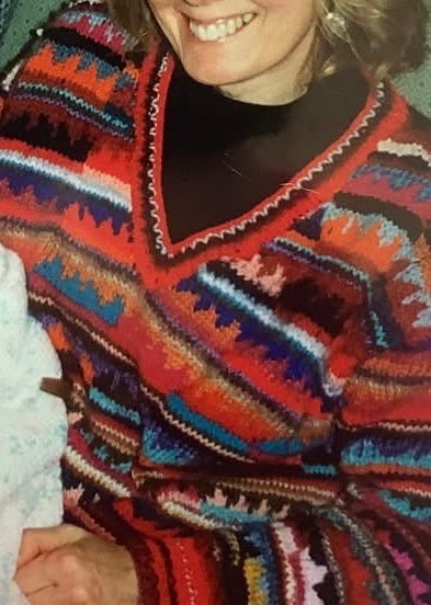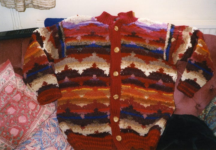 Many years ago, and we are talking decades here, I discovered Kaffe Fassett and I did make two of his patterns despite never having been successful in knitting at all. But I had gradually acquired a largish collection of yarns I’d scavenged from oddments and sales bin. All different textures, make up, colours, and weights. Perfect for beginning colour work. I didn’t swatch I just went for it. The cardigan was started twice as I made it way too big the first time, but I managed it. The second was this one, which I actually made for some one else, my mum. That one had so many different colours and yarns in it. It was very forgiving if you made a mistake too.