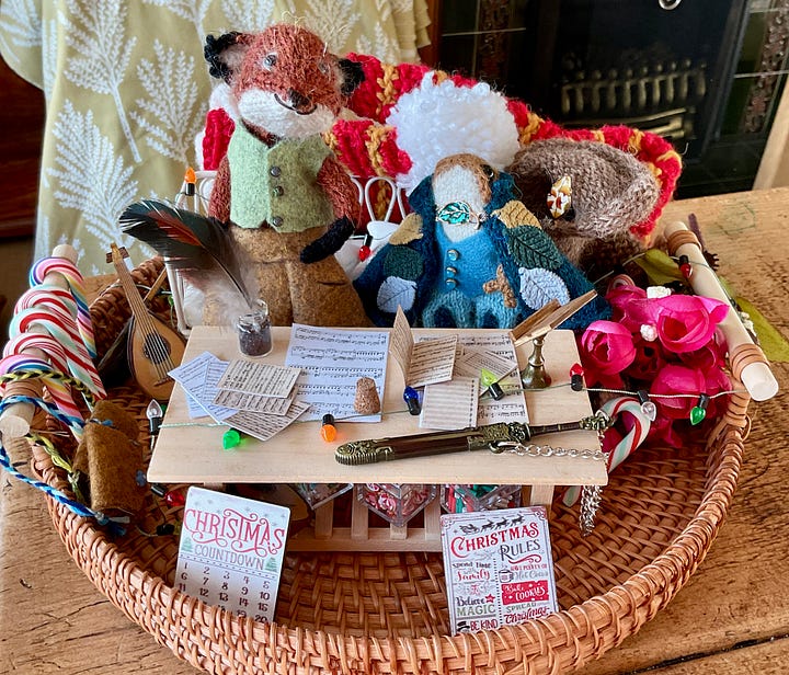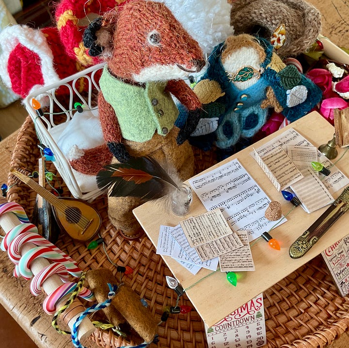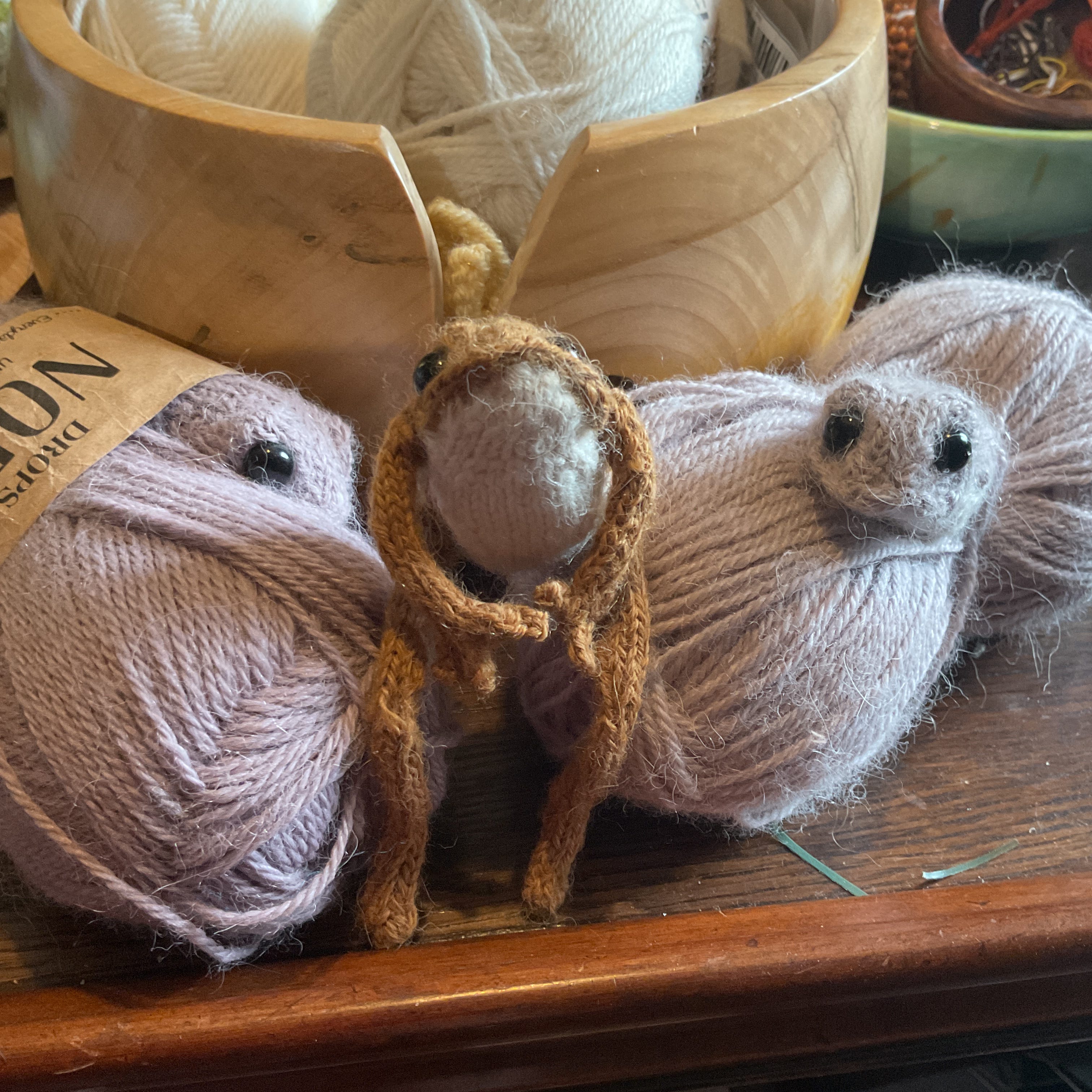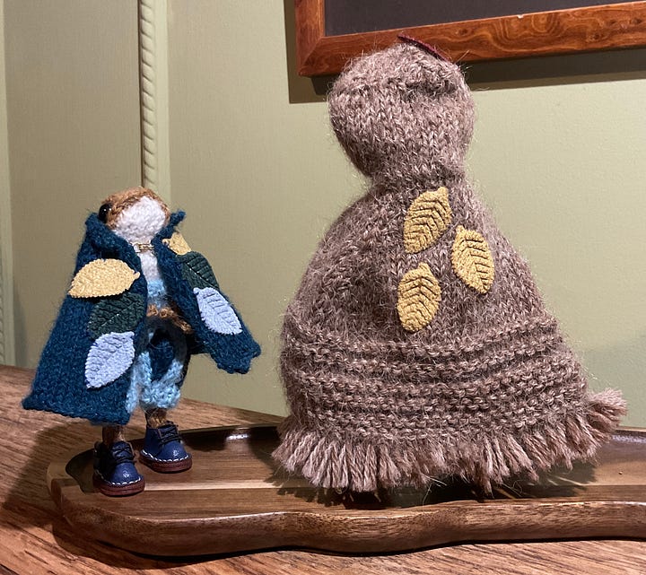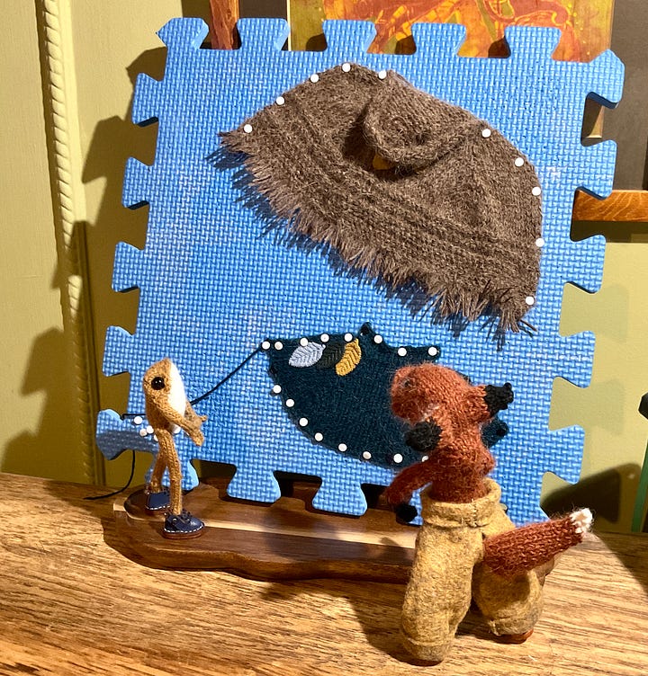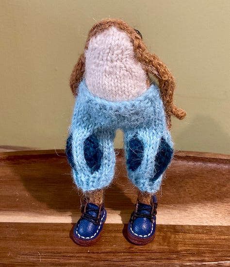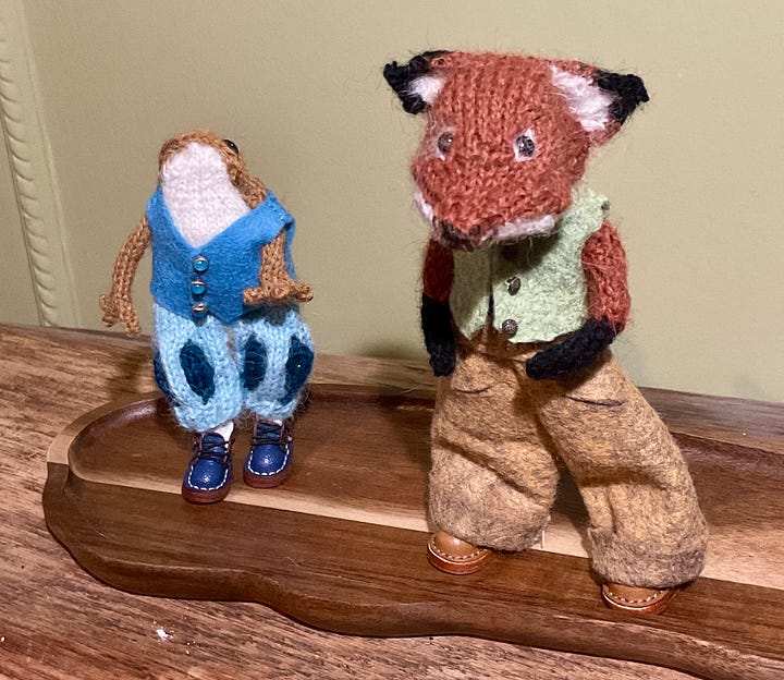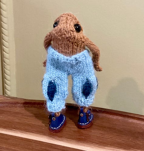 I had a lovely message recently outlining the idea of a Knitted Ones troupe, made up of a variety of animals. This really grabbed my imagination. A fox and a froglet were needed. This little one piped up from the Pool of Life and expressed a very keen desire to be a bard. I fully expected to make a brand new froglet but this one was insistent.