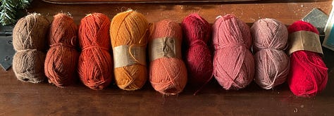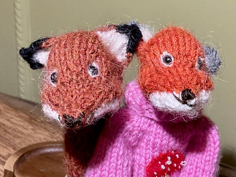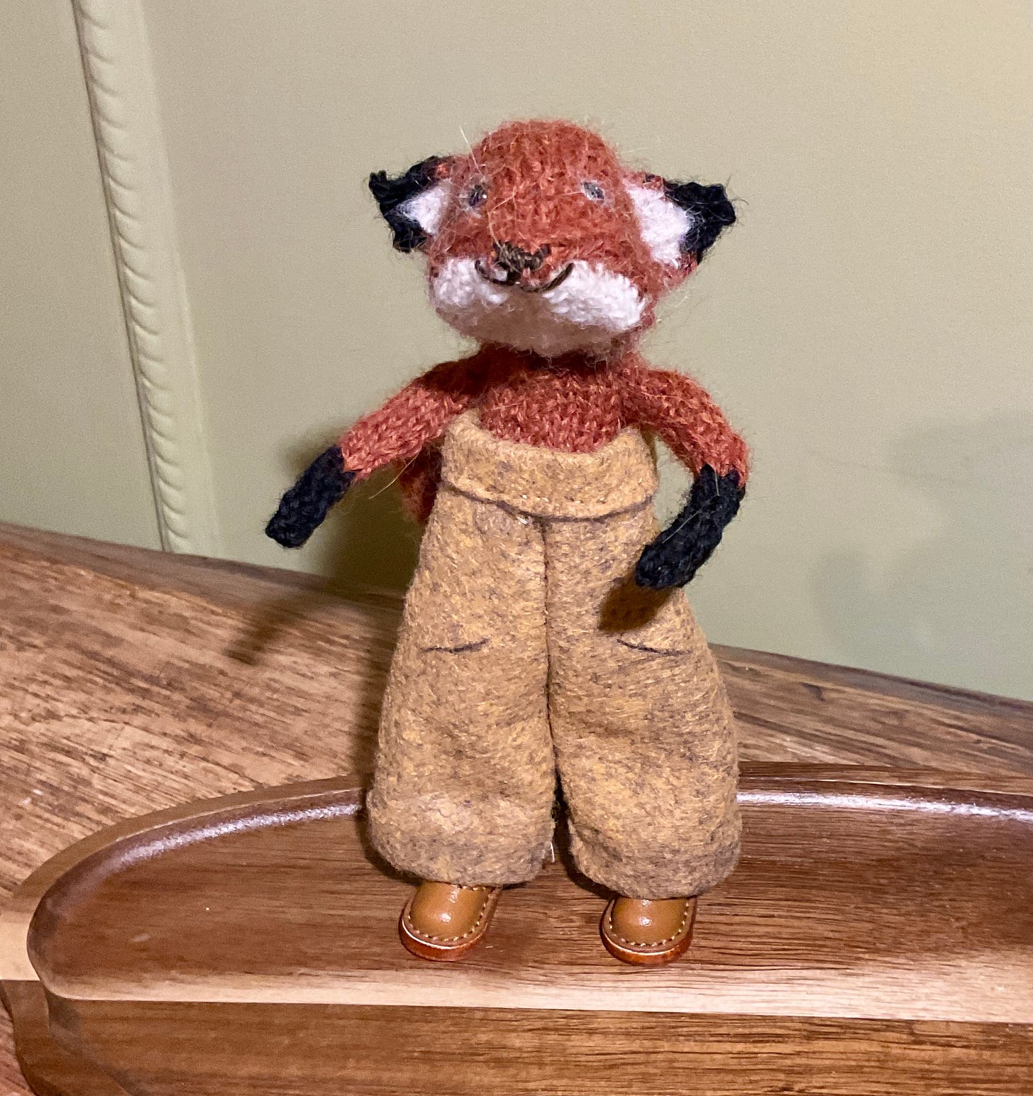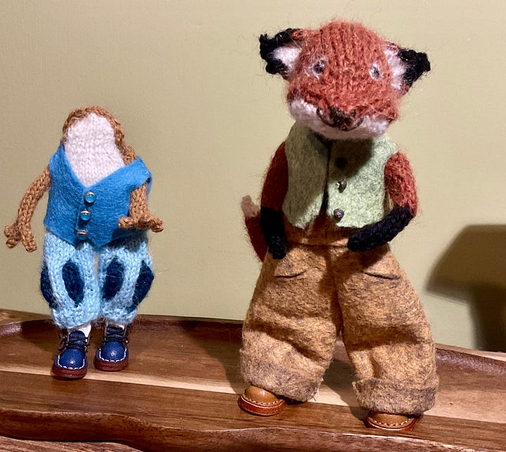 He was quite insistent that I make the fox next before concentrating on clothes. And who am I to argue? First of all we had to decide which colour yarn to use and came up with the russet. The fifth pic show the difference in tone between what I normally use. I think I might actually prefer this shade. And look at that sweet face, isnβt he a charmer? Meet Peregrine.