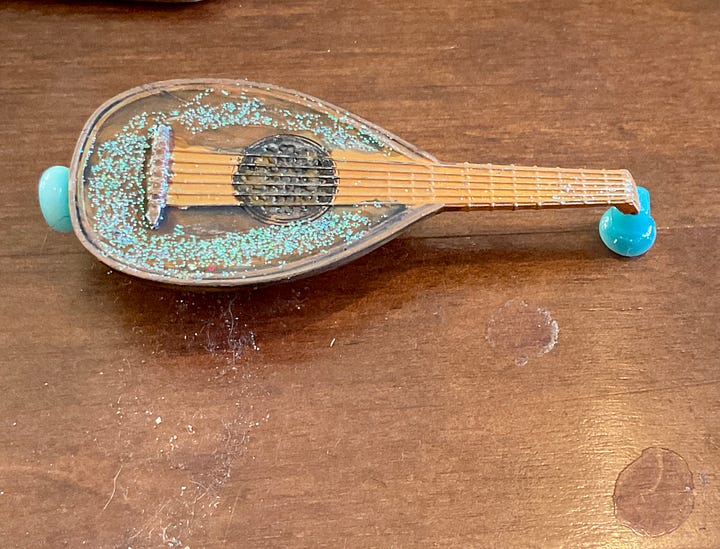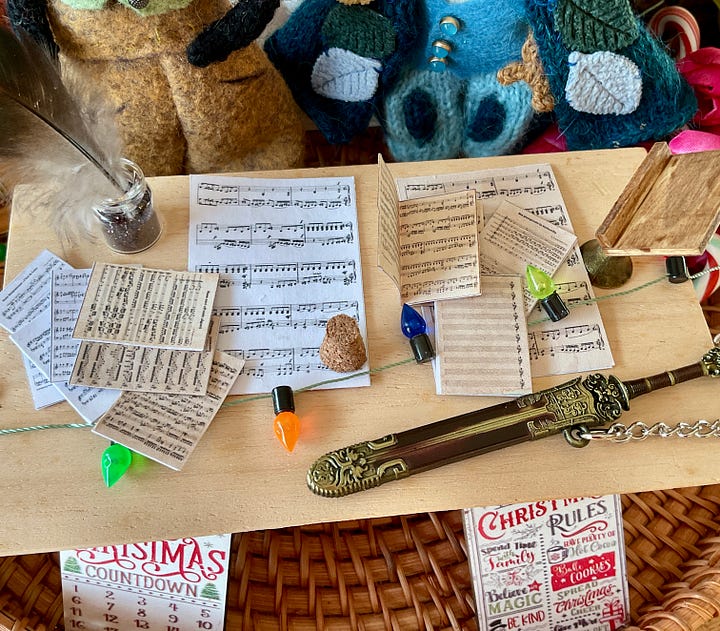 Before they left for their new home I sorted out their accessories, a bag each, a scroll and music. Peregrine writes with a feather pen, Lannar canβt be bothered with dipping into ink and uses a pencil. Peregrine has a sword for protection, Lannnar believes his music will save him. Both play the lute, though Lannar decided to bling his up, which Iβm really not sure about especially the glitter, but he says itβs wonderful.
