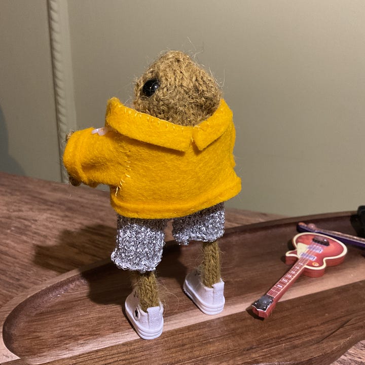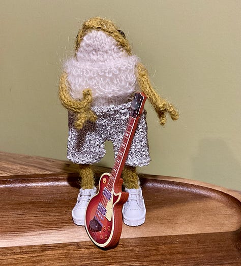 Next he asked for a yellow jacket, like his iconic hero. Now working in miniature is tricky so I did the best I could. I think he likes it anyway. He settled for the white sneakers and the brown guitar (the purple just clashed a bit too much)