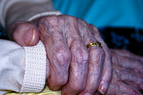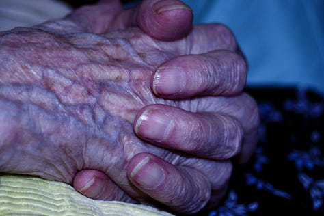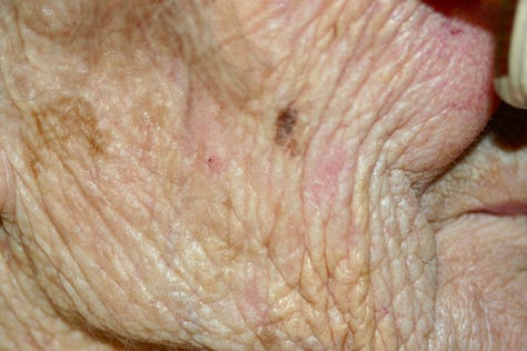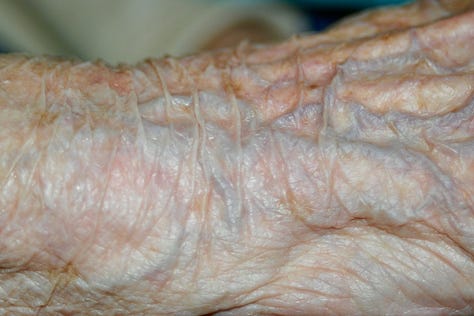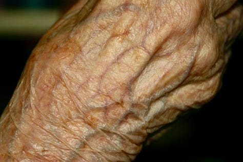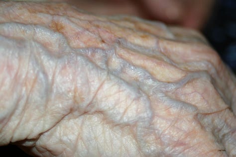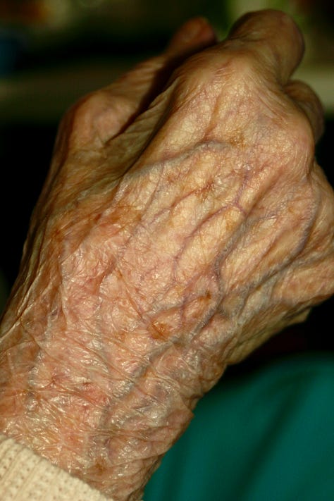Many years ago I was much more involved in my photography and I decided I wanted to photograph my Granny’s skin. Most people get grossed out by these photos but I was completely captivated by the wrinkles, the blemishes, the blue veins on the thin skin, the paperlikeness to the skin and how it almost shimmered etc. I’m not sure how I got her to agree, but there we go.