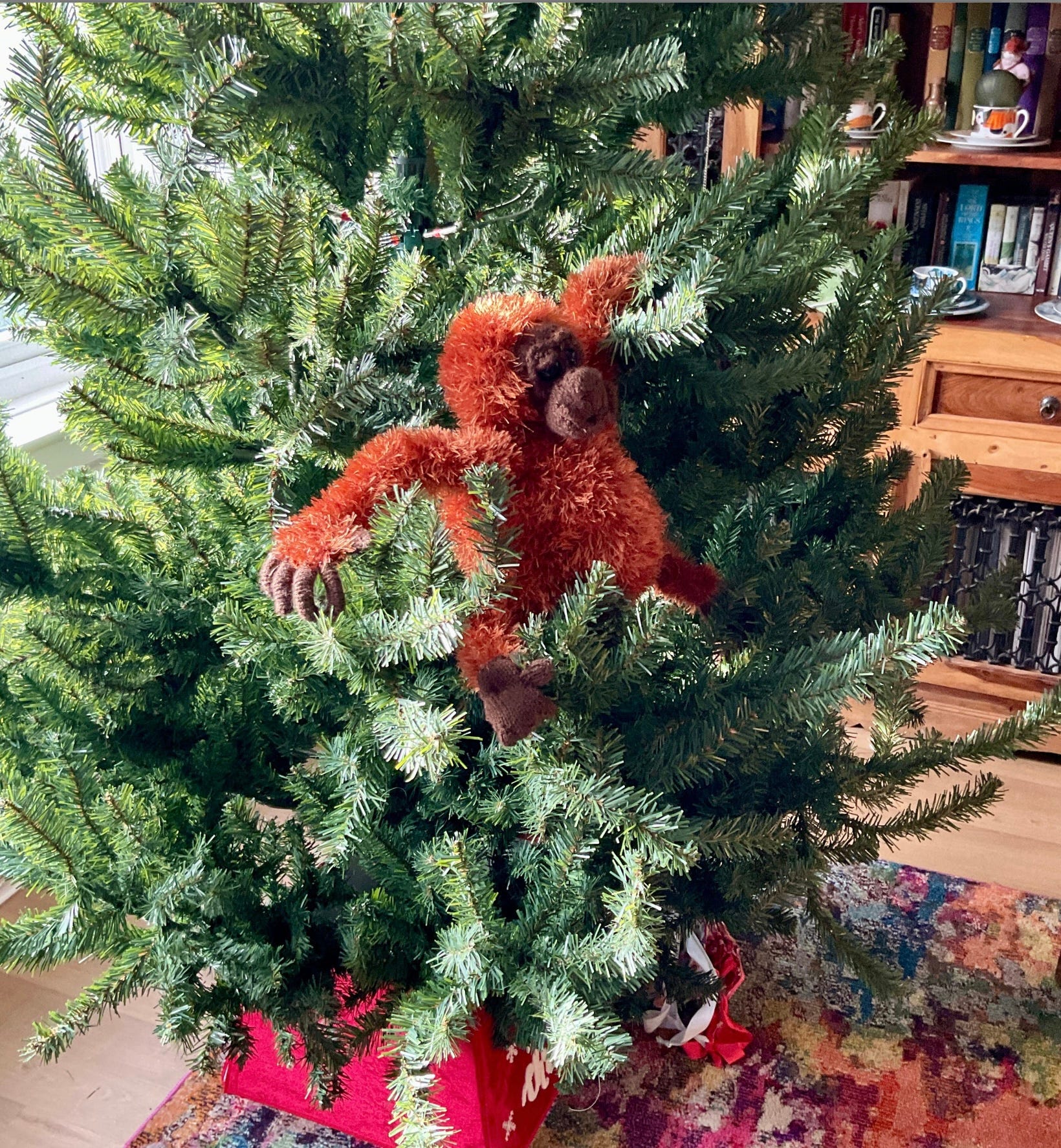 Once it was suggested I make an orangutan/orangutang/orang-utan (there is no consensus on how to spell it). So is the visual story of how Oscar Ook came into being. Firstly I needed to find a pattern and finding one I felt gave enough character was a task in itself. But find one I did, itβs actually a tea-cosy pattern but easily converted (as the pattern writer Susan Cooper on Ravelry noted). The pattern and yarn required meant this was always going to be a bigger end product than my normal frog. I started with the intent to make the pattern as written and see how I could change it afterwards to make it smaller. The trouble with smaller is finding yarn that will work. For the uninitiated, thicker yarns need thicker needles make bigger products. Thinner yarns are not always available in the fluffiness required for fur etc. and as yet 2 years later Iβve not managed to find the right yarn.