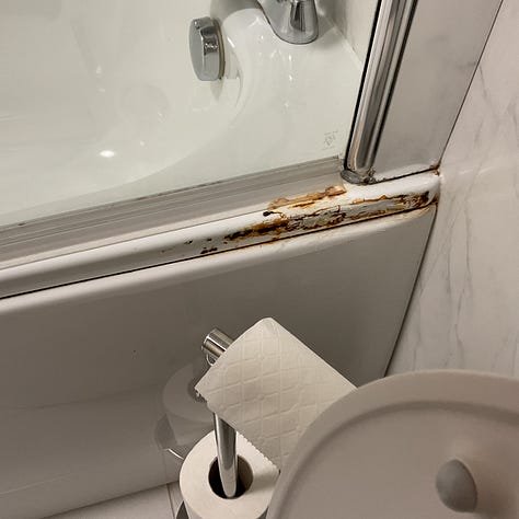 The shower in that lodging is ugly, but looks more like rust than filth. The mold on the wall, however, is a health issue. I would have looked for another place to stay.
