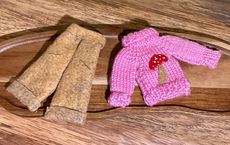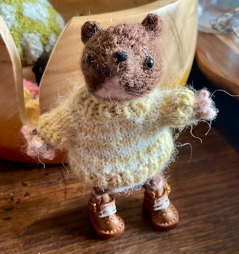 I took time out from frogs and made Freddy here. The bright outfit won out so I need to make another fox for the pink jumper set. i also made a very misshapen shrew. I obviously went wrong somewhere.