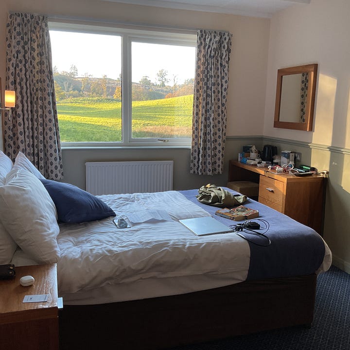 R and I took a few days away to sort of make up for my lack of participation in the Scotland holiday. A lot shorter drive - 1.5 hours - and just us. Off to near Lake Windermere in Cumbria. Got a deal on t’internet. Now I have to say I feel a bit aggrieved at our room. It’s fine, small, old, Travelodge fine, but fine. The bathroom leaves a bit to be desired. Rusty bath and filled badly in a couple of sections and dirty underneath where the side board met it, filthy light pull and emersion pull, stains in the wardrobe, mould in the window, hole in the curtain and missing curtain hooks. Then the shower was fritzed and didn’t work well either. Of course we didn’t complain. It was okay, I suppose. My thinking is that if you get people in on deals to sell rooms maybe make sure the rooms are up to scratch so they might want to come back. It might have been a deal but it wasn’t cheap either. But the view was nice.