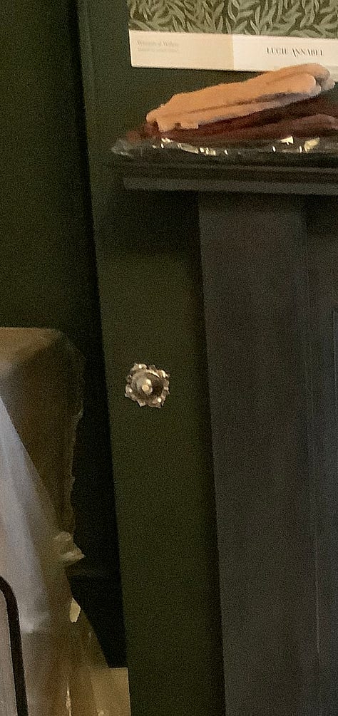 This ugly ex servant bell cover has been bugging me for over 2 years. We do have some that work but this one didn’t. Upon investigation the wires no longer existed so it couldn’t be reinstated. So I finally decided to do something about it. Removed that tacky plastic - yes plastic - cover and replaced it with a much more in keeping example. No, it still doesn’t work but it does cover a gaping hole in the wall that would take a lot more work to make good. It now pleases me.