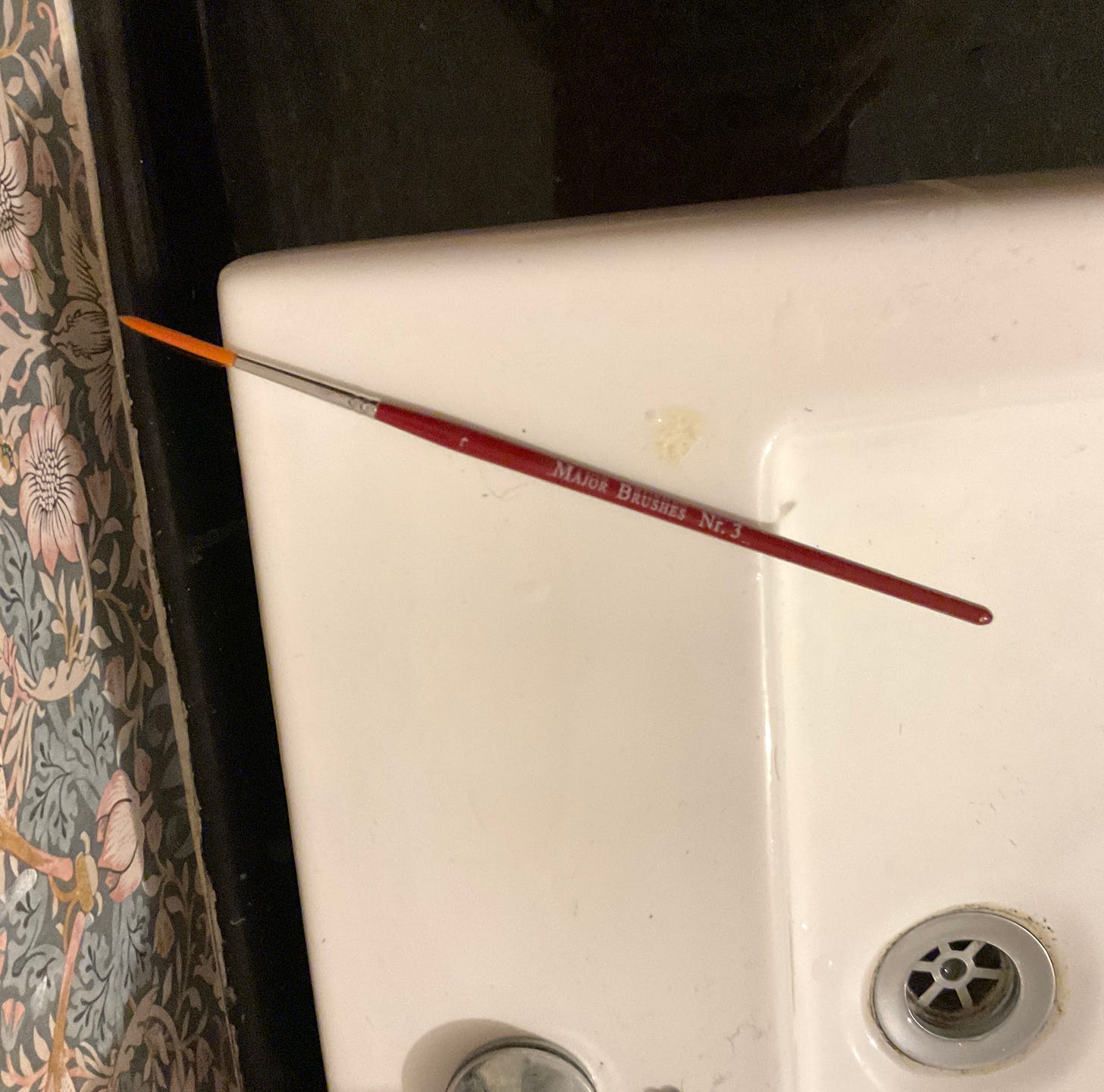 After a long summer break, art supplies have begun their yearly migration to the main bathroom. Here we see a nr. 3 soft bristle brush airing itself after a quick wash in the sink. It is day dreaming about the brush strokes William Morris would have made creating the original wallpaper design.