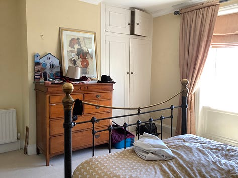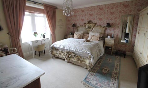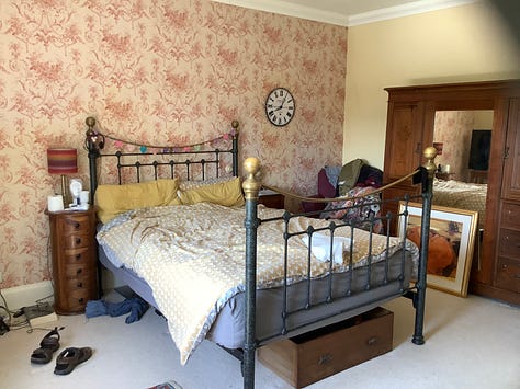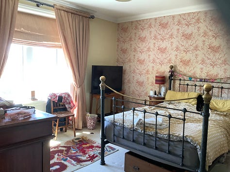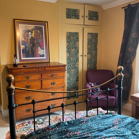We had our bedroom decorated. Rather indulgent I felt as we havenโt decorated the rest of the house yet, but sometimes you do stuff for you not for others. The first pic is from the online ad for the house, the next three pics are from when we first moved in. Pale yellow on the walls and a pinky red on the wallpaper. Not bad colours but the wallpaper was faded where the previous owners had mirrors etc. The curtains were silk but very frayed and faded and they didnโt draw across properly, the blind didnโt work well either. The previous owners style was Rococo and painted furniture, a very valid style but not my style at all. The after pics are just wonderful in my view. Iโve used that yellow in two houses now and love it, itโs also in our dining room. R โchoseโ the wallpaper and he says itโs โokayโ. Of course he is understating it as itโs sublime. We have a proper black out blind now, and proper curtains. Iโm still considering whether they will stay, they are a little short as they were porch curtains in the previous house, made from tapestry fabric picked up in a charity shop in Welshpool for a ridiculously cheap price. I do have spare fabric to lengthen them if wanted but need to work that one out. They arenโt perfect but they arenโt bad either. Also the chandelier type light fitting went as I donโt like them, I find them a little ostentatious but it fitted the Rococo theme. We now have a simple glass shade. I am rather pleased with the cupboard, a last minute thought that worked well I feel.