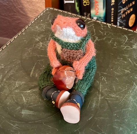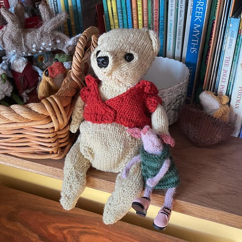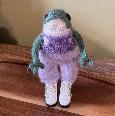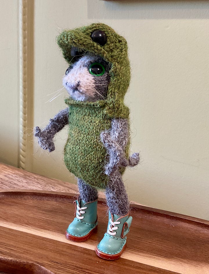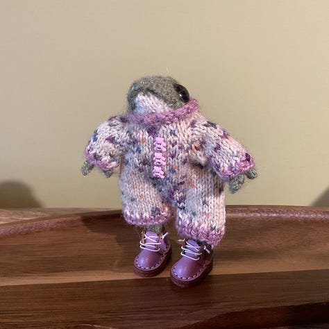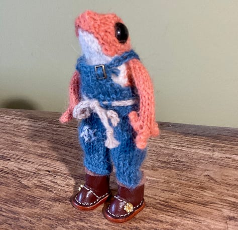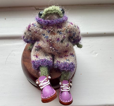 Itโs been a busy month for Knitted Ones. A big crash means I sit on the sofa bored and so knit more. First there was Little Anna, the smallest of tadpoles. Then Kitty a gardener both off to the USA. Then Maude a horticulturist, and Maisy another smaller tadpole, similar but not quite the same - I like to make them all a little different. Badger got an upgrade with boots and new dungarees. Flora also fancied dungarees so it was a dungarees month. Pooh bear and piglet and a wee kitten in a frog costume.