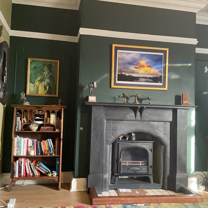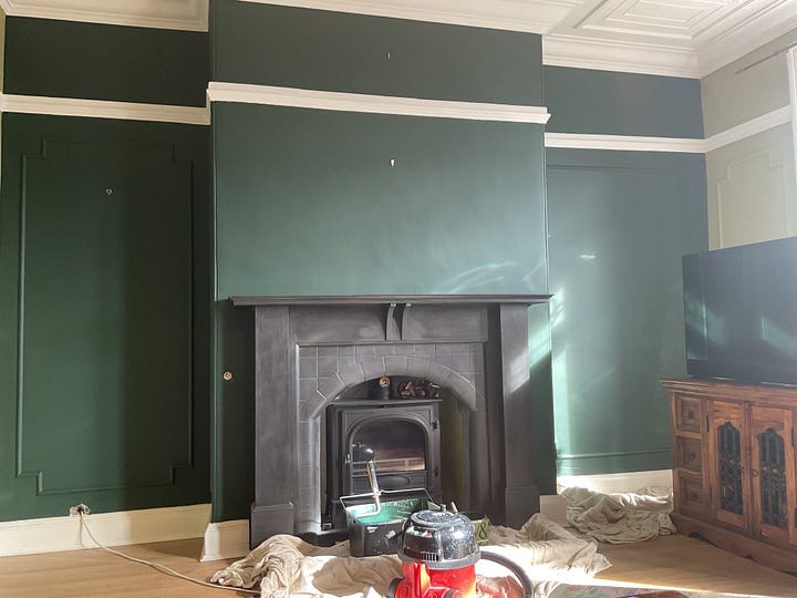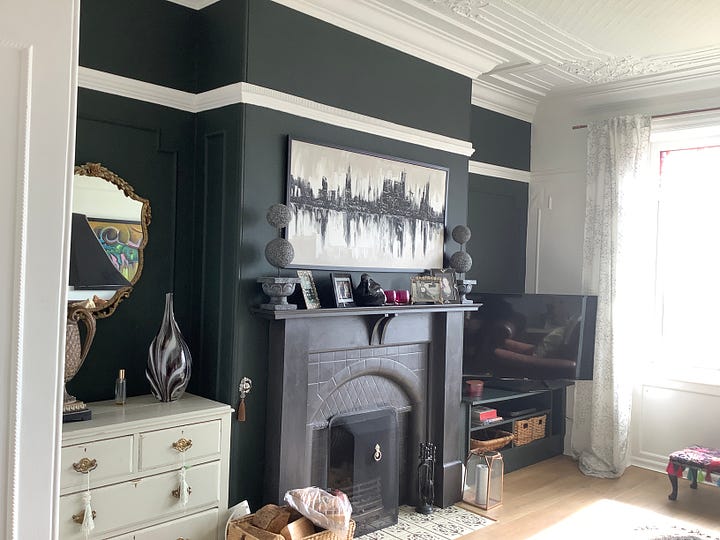 We also had some work done in the living room, there was damp damage from a now fixed leak behind the TV and I took the opportunity to have the whole section repainted. It was an almost black Farrow and Ball paint, but it marked so easily and Iโm nothing if not the wife of a true Yorkshire man so I wasnโt going to fork out for F&B and went for a close match at B&Q. Itโs a bit greener but still similar. It looks fab all clean and mark free. First pic is the estate agents pic, then before, then after, then after and with everything back in its place. As you can see not much difference at all. When the sun hit the F&B it shone green, this paint is green even without the sun.