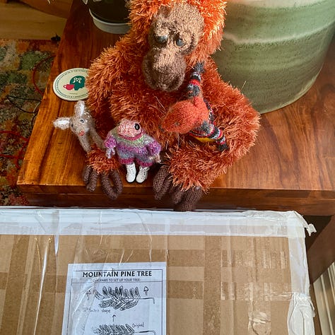 Ook was the ideal partner again this year and brought with him, Fawn, an as yet unnamed froglet, and Freddy Fox with him this year. Last yearโs fox is in their new home and hopefully learned the lessons of how to dress a tree well. They all waited with impatience whilst the box was delivered by R from the lofty, dusty loft. Whilst Oscar and Fawn examined the tree the other two went to play with the decorations.