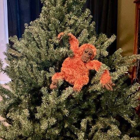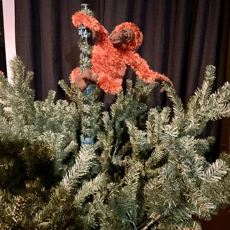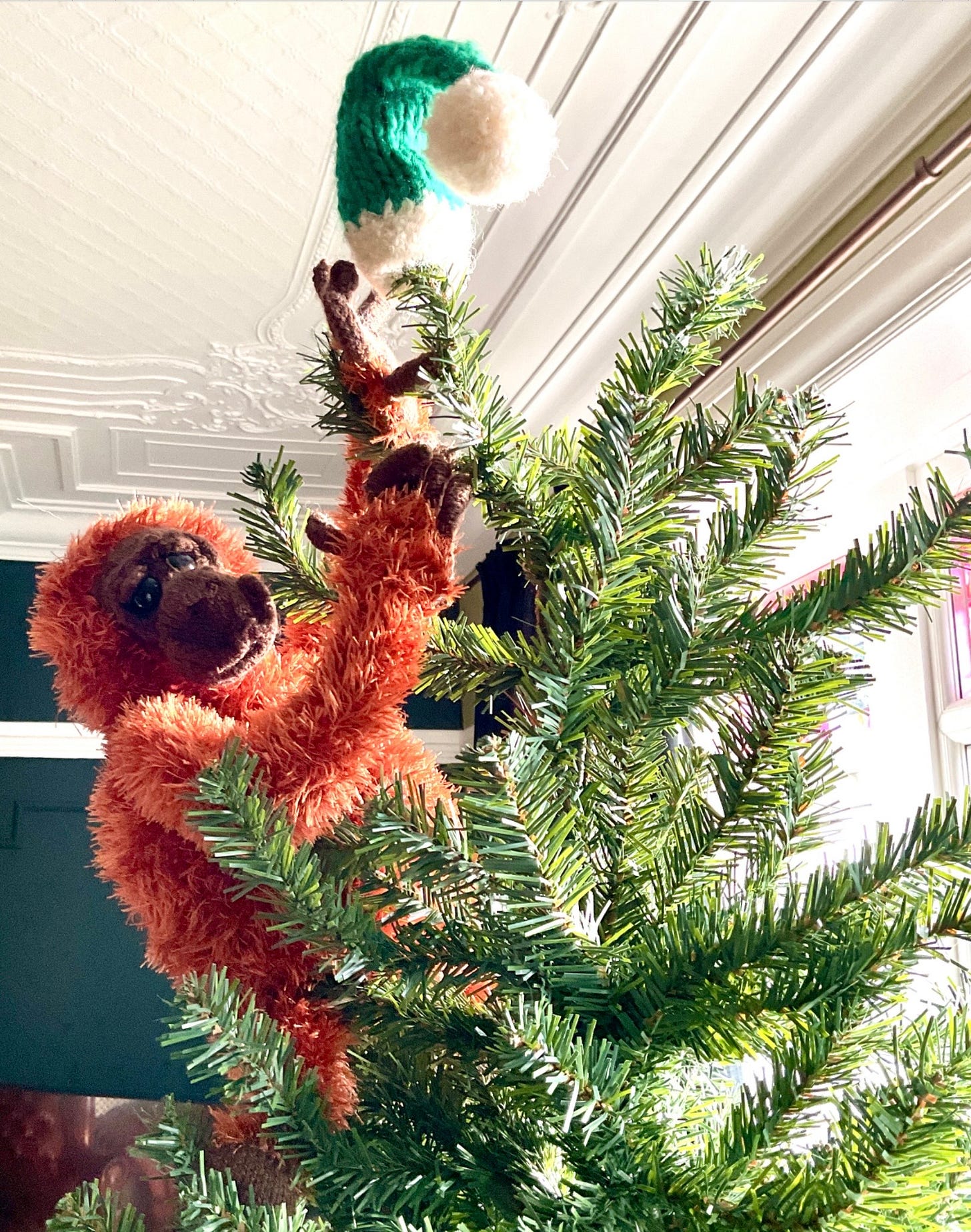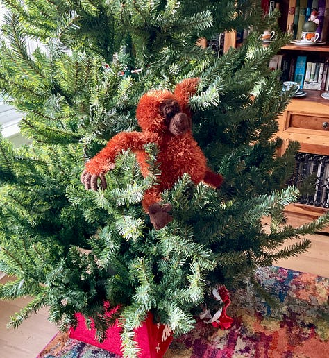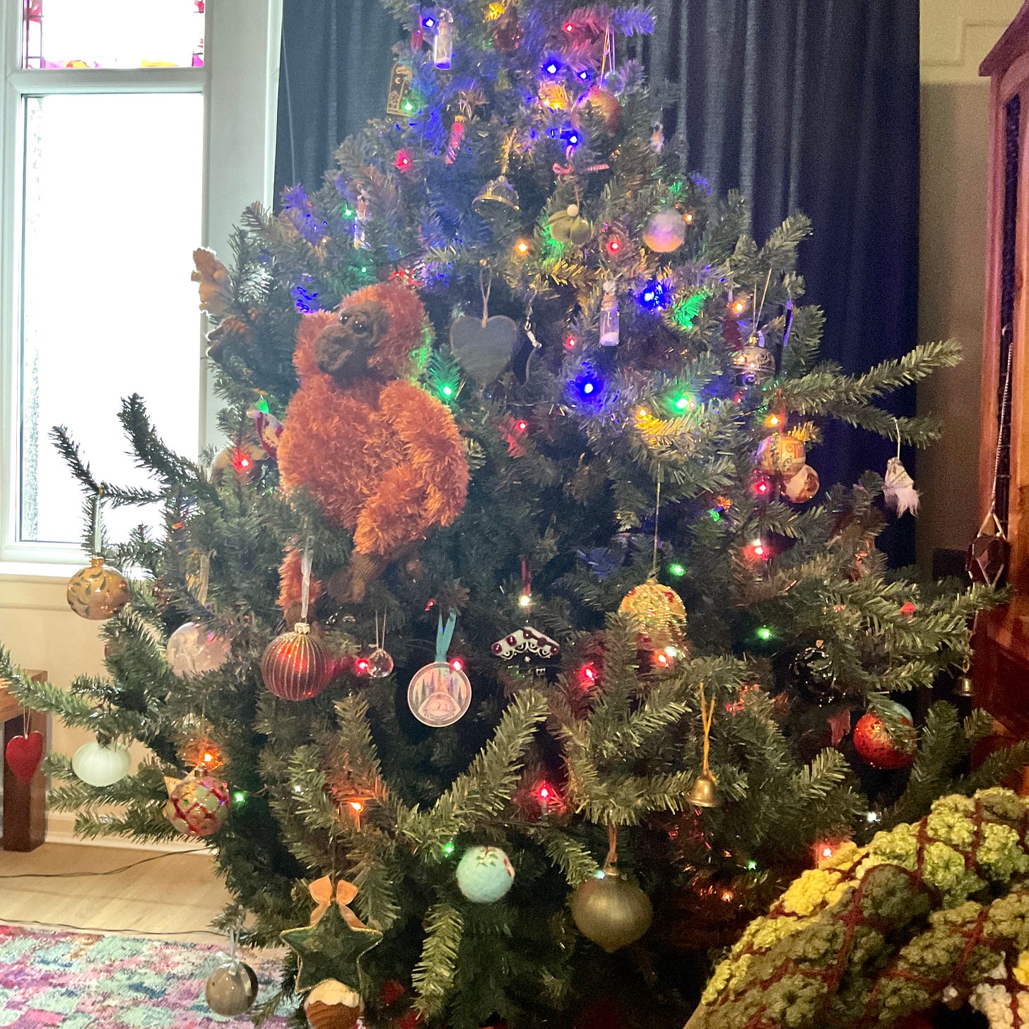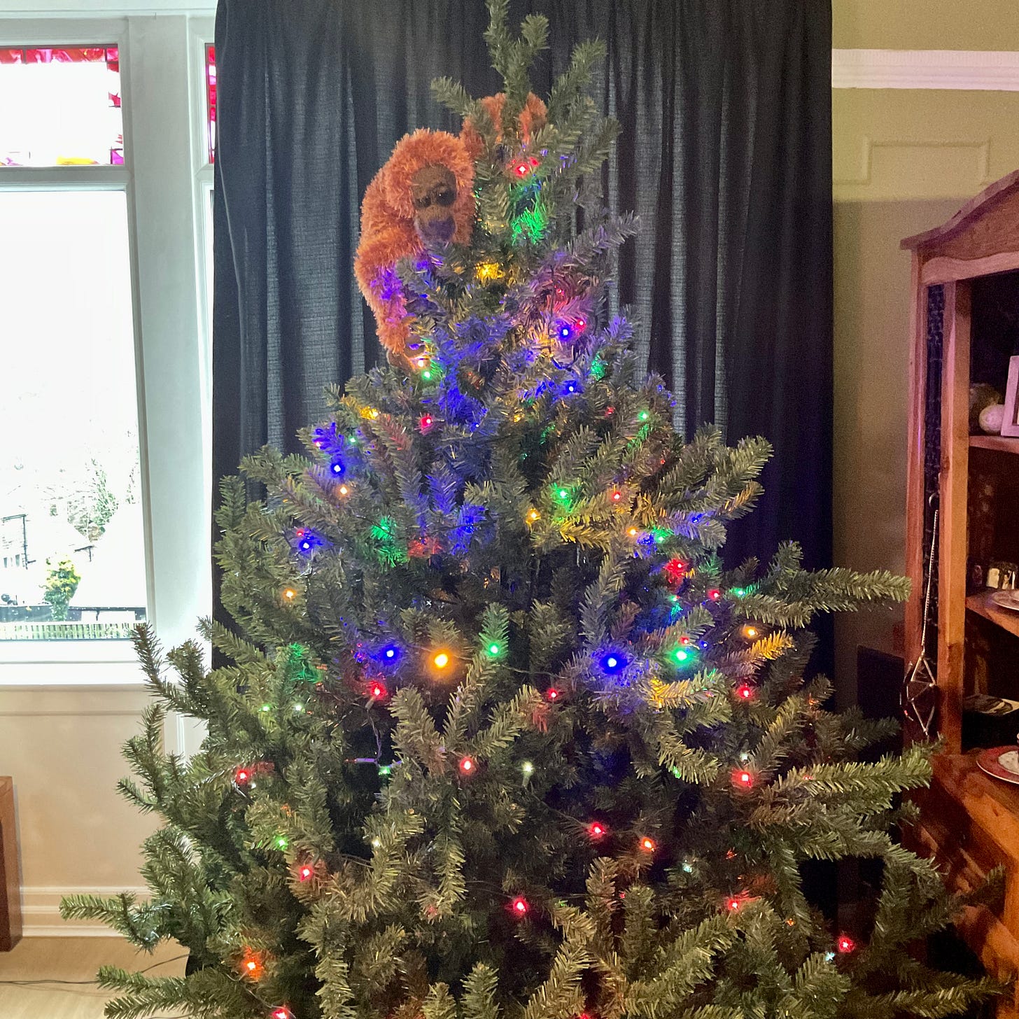 Then we needed to test the lights. They had been carefully packed away last year but Ook soon had them muddled up. Wearing them didnโt help. But the checks were completed and operation Decorate the Tree commenced.